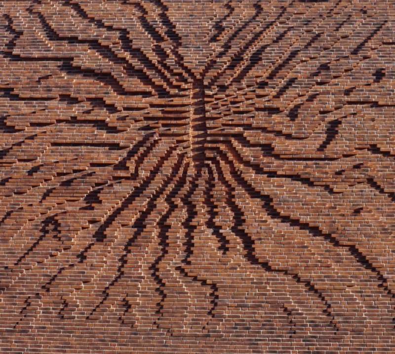 Trails of progress Konstnären Mattias Bäcklin har skapat ett unikt konstverk på Hästhagsskolans fasad i Farsta, där han med hjälp av fasadtegel har integrerat naturinspirerade motiv i byggnadens arkitektur.